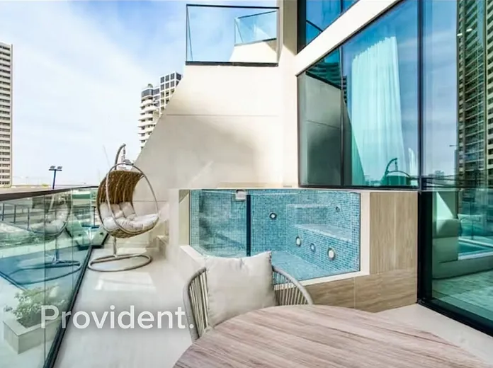 The apartment features a spacious layout with two elegantly finished bathrooms and a private jacuzzi, offering a resort-style living experience within the comfort of your own home. Floor-to-ceiling windows enhance natural light, while premium materials and contemporary finishes create a refined interior atmosphere.
